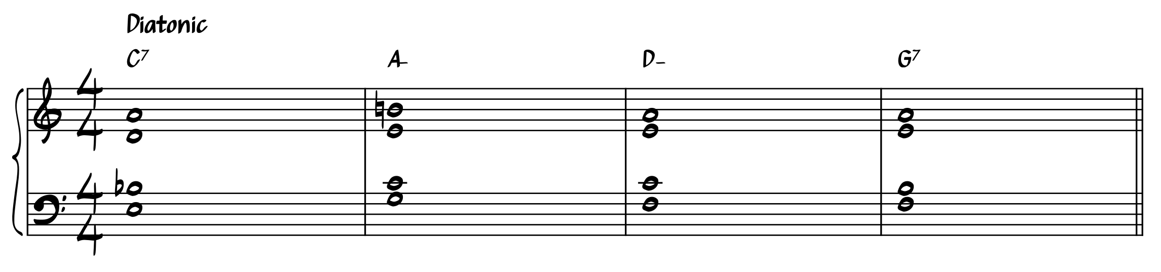 Step 1: Our most basic turnaround. A 1-6-2-5 progression, using all chords which are diatonic to the key (presented here on a blues in C):