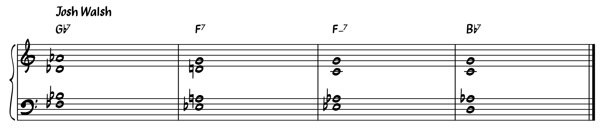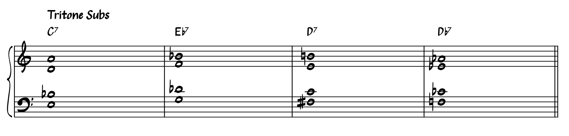 Step 3: Apply the tritone sub. Take any of the dominant chords, and substitute it with a dominant chord that is a tritone away. (eg. A7 becomes Eb7). In my example voicing, the left hand will stay the same, but the right hand notes each come down a half step.