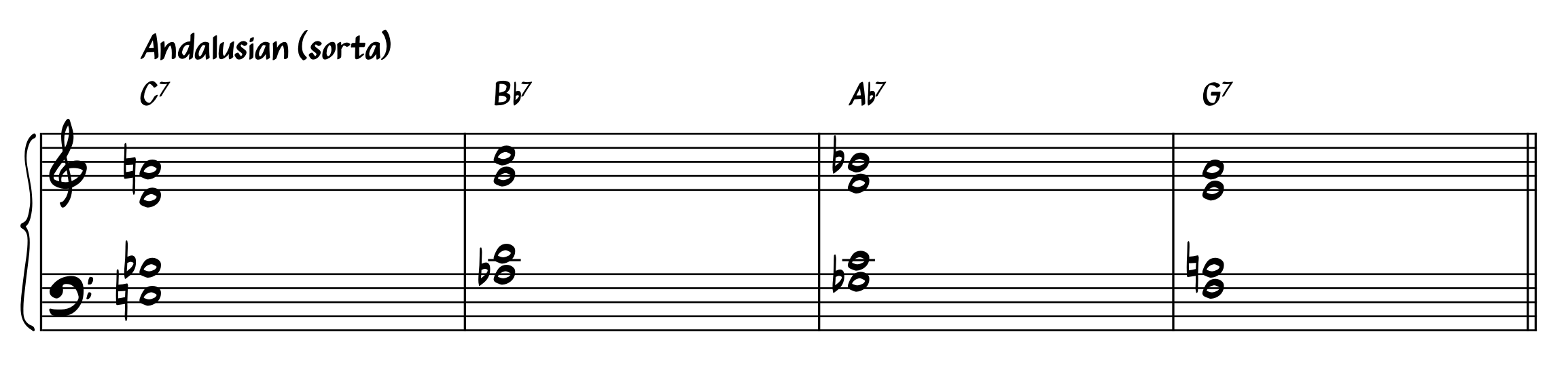An Andalusian Cadence is progression where chords drop by whole steps, usually ending on a minor chord. (Hit the Road Jack).