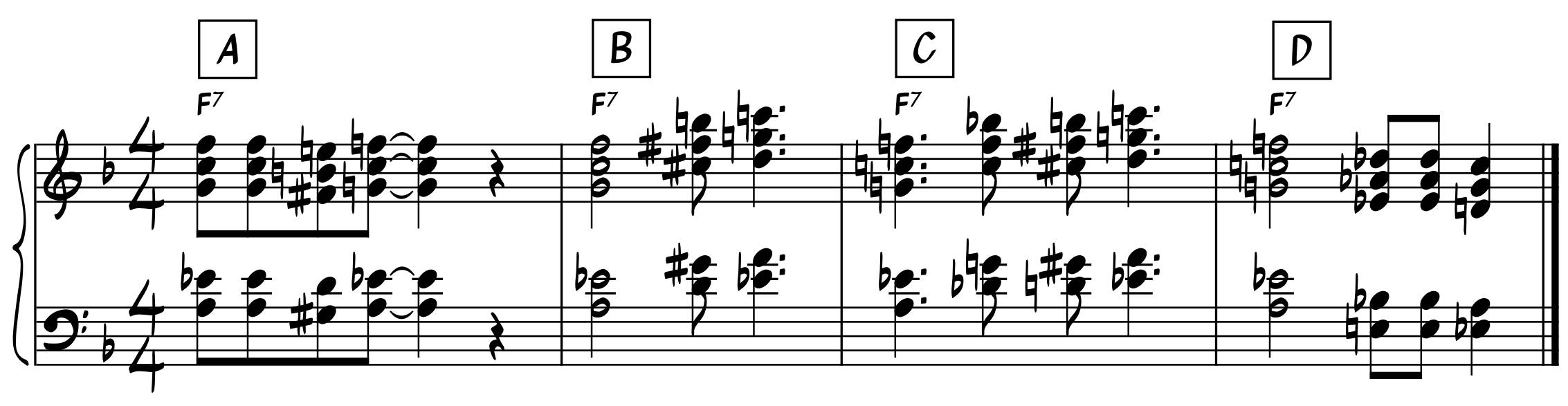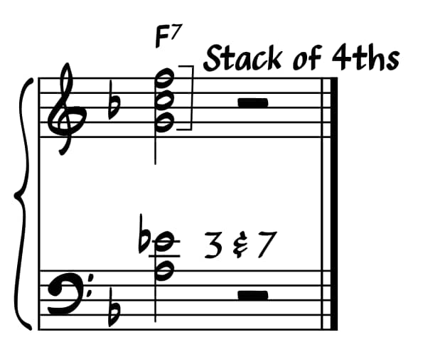 This voicing has our essential tones for F7 in the left hand, that's our 3rd (A) and 7th (Eb). In the right hand, we're building from the top down. On top is the root (F) and then 2 more notes, each of which is a perfect 4th below.