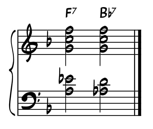 It's important we know both of these inversions, as it helps us create smooth voice leading between chords. For example, if we were playing F7 and then Bb7, we could voice the chords like this, with F (the root) on top of the F7 chord, and F (the fifth) of the Bb7 chord. Only the left hand has to change. 😎