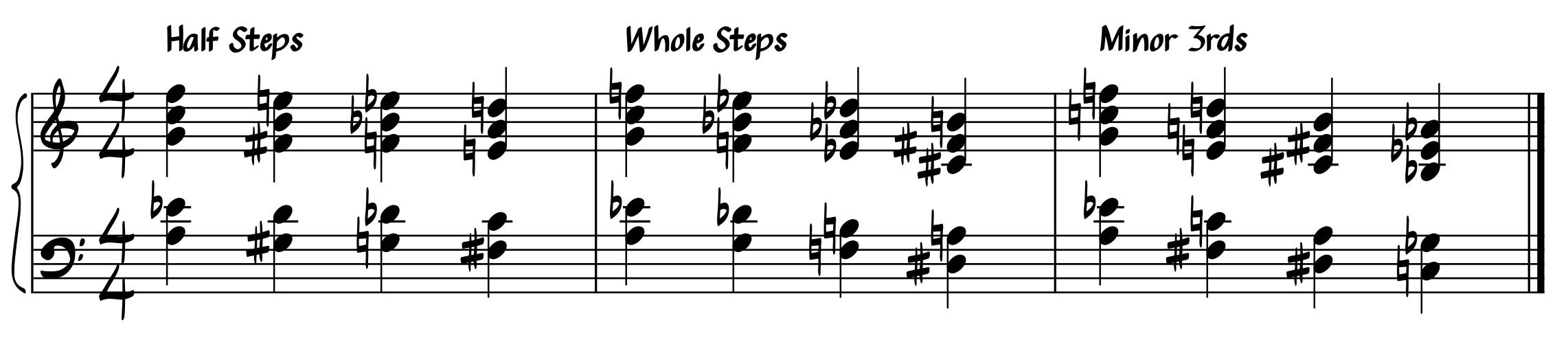 Practice moving this shape around the keyboard. Start with the easiest, by moving the chord down in half-steps. (I wrote 4 of them for you, but you gotta do all 12!)