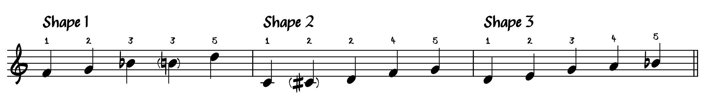 Below are 3 hand shapes. Each of these shapes is played with your right hand in a static position, using the fingering I provided.