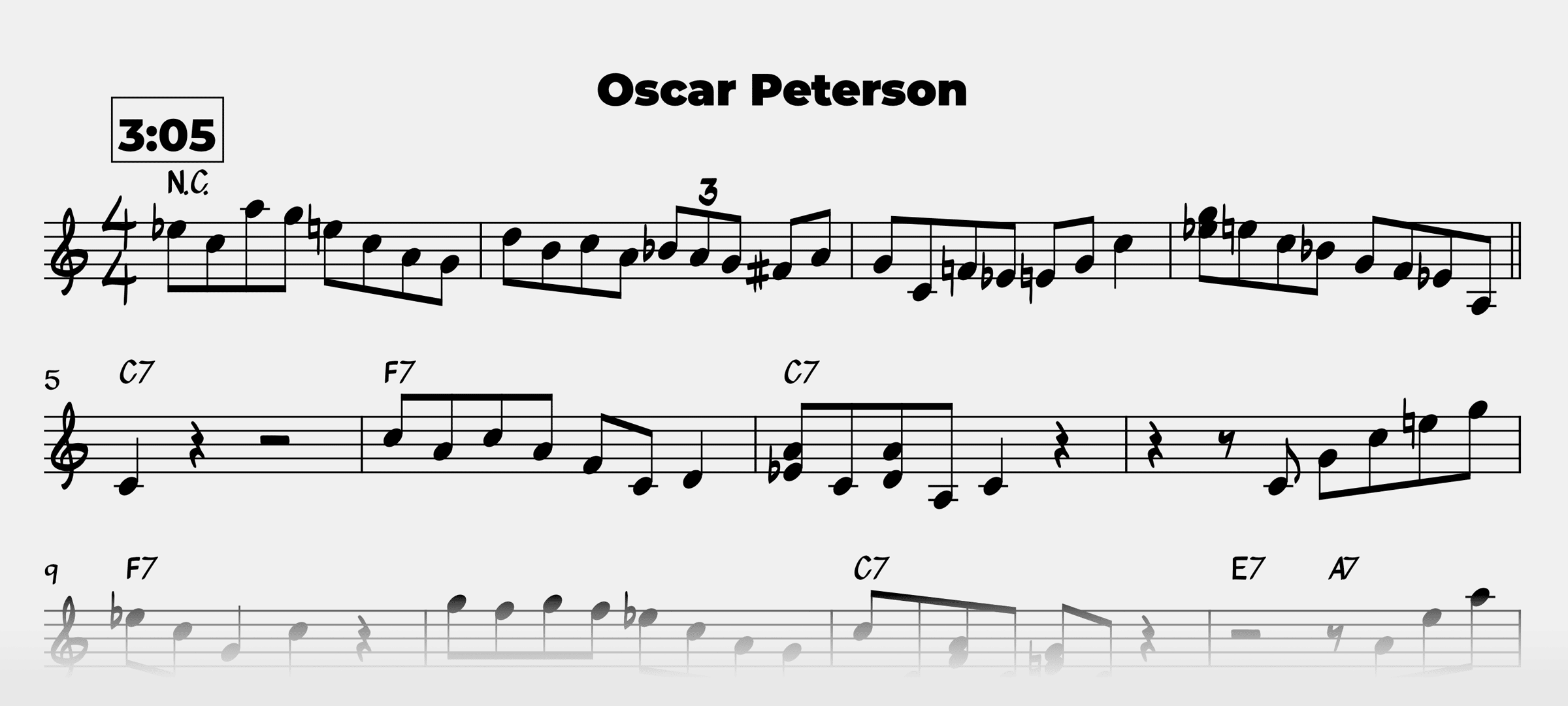 Reader, After we wrapped up our workshop last Friday, I was listening to a few different performances of Oscar Peterson playing our tune, Someday My Prince Will Come. There were some great moments, but this phrase below really stuck out to me as a perfect representation of what we've been practicing. Streams of eighth notes, chord tones on the strong beats, handing over smoothly from one chord to the next. I wanted to make sure you had a chance to see it too. Oscar Peterson on Someday My...